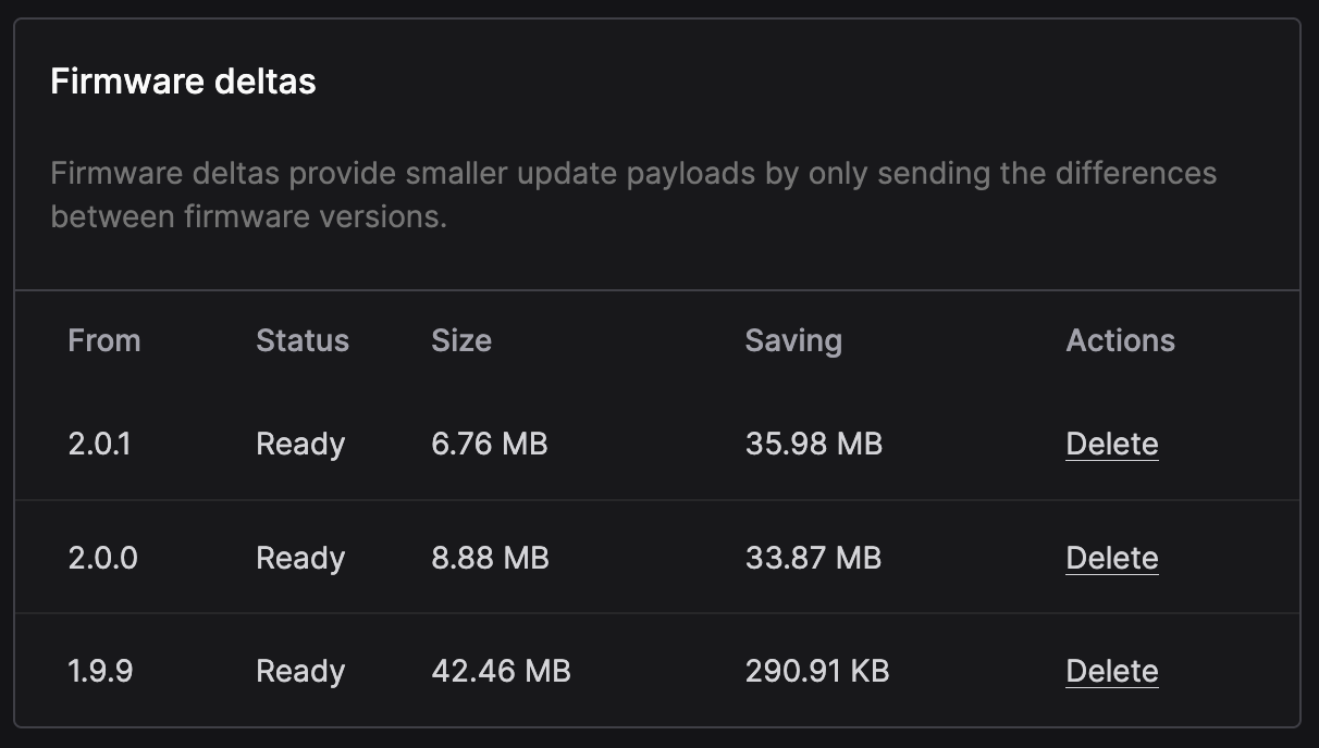 Deployments are paused while the deltas are generated, allowing you to deliver the smallest firmwares to your connected devices.